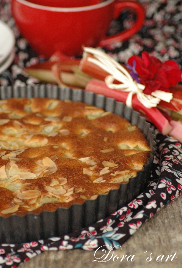 - Cesto nalejeme do formy, posypeme rebarborou, mandľovými lupienkami a nakoniec hnedým cukrom. Pečieme cca 30-35 minút.